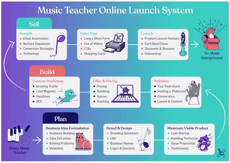 In Music Teacher Startup, we’ll walk you step-by-step through the entire process of designing, building, marketing and launching a great online product or service, whether you already have something to sell or not.